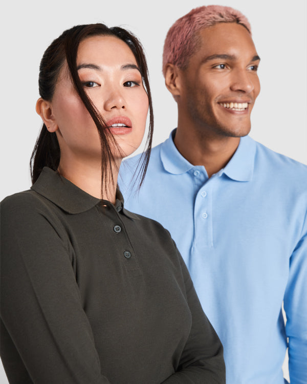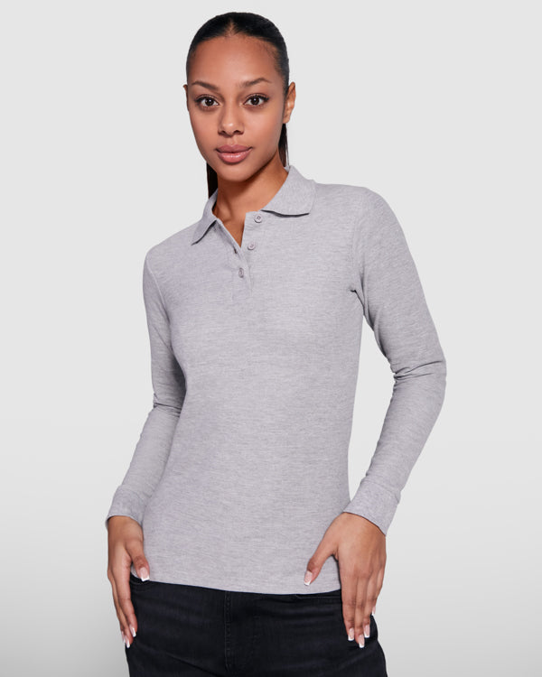 Long-sleeve polo shirt with ribbed collar and cuffs, 3-button placket and elastane 1x1 ribbed cuffs. Reinforced covered seams in collar.