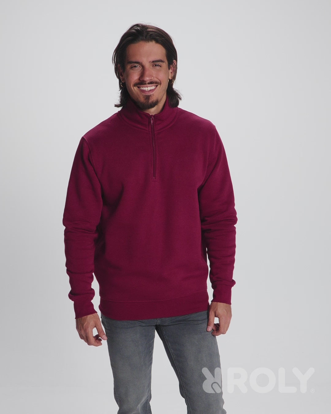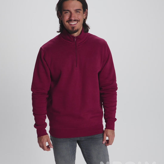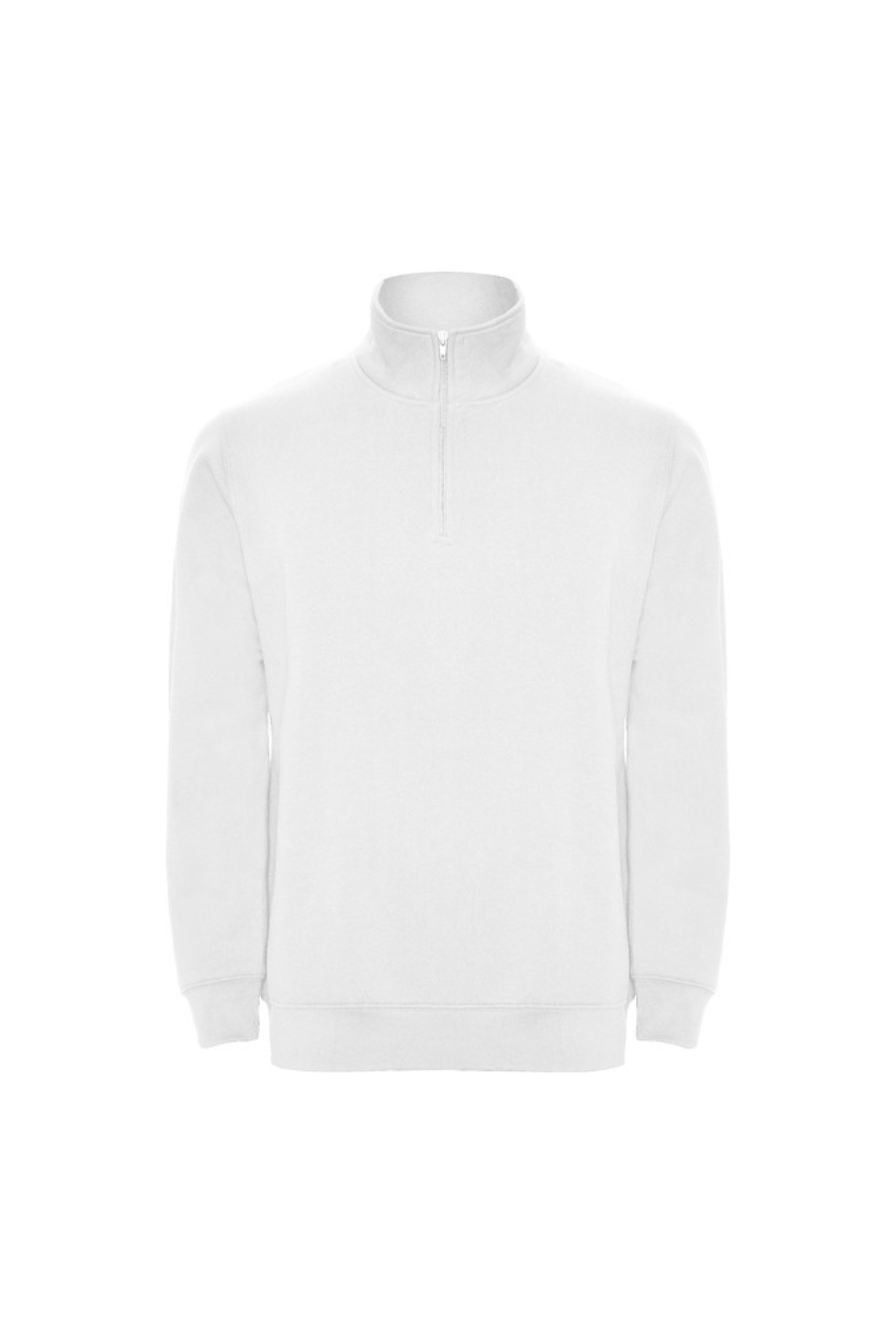 Sweatshirt with matching half zip and polo neck. Matching inner collar. Reinforced covered seams on inner collar. 1x1 ribbed cuffs and waist.
