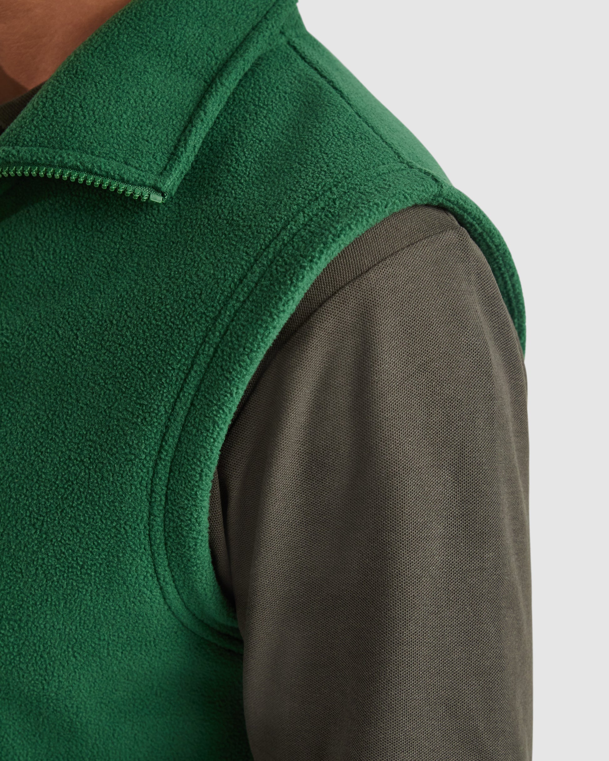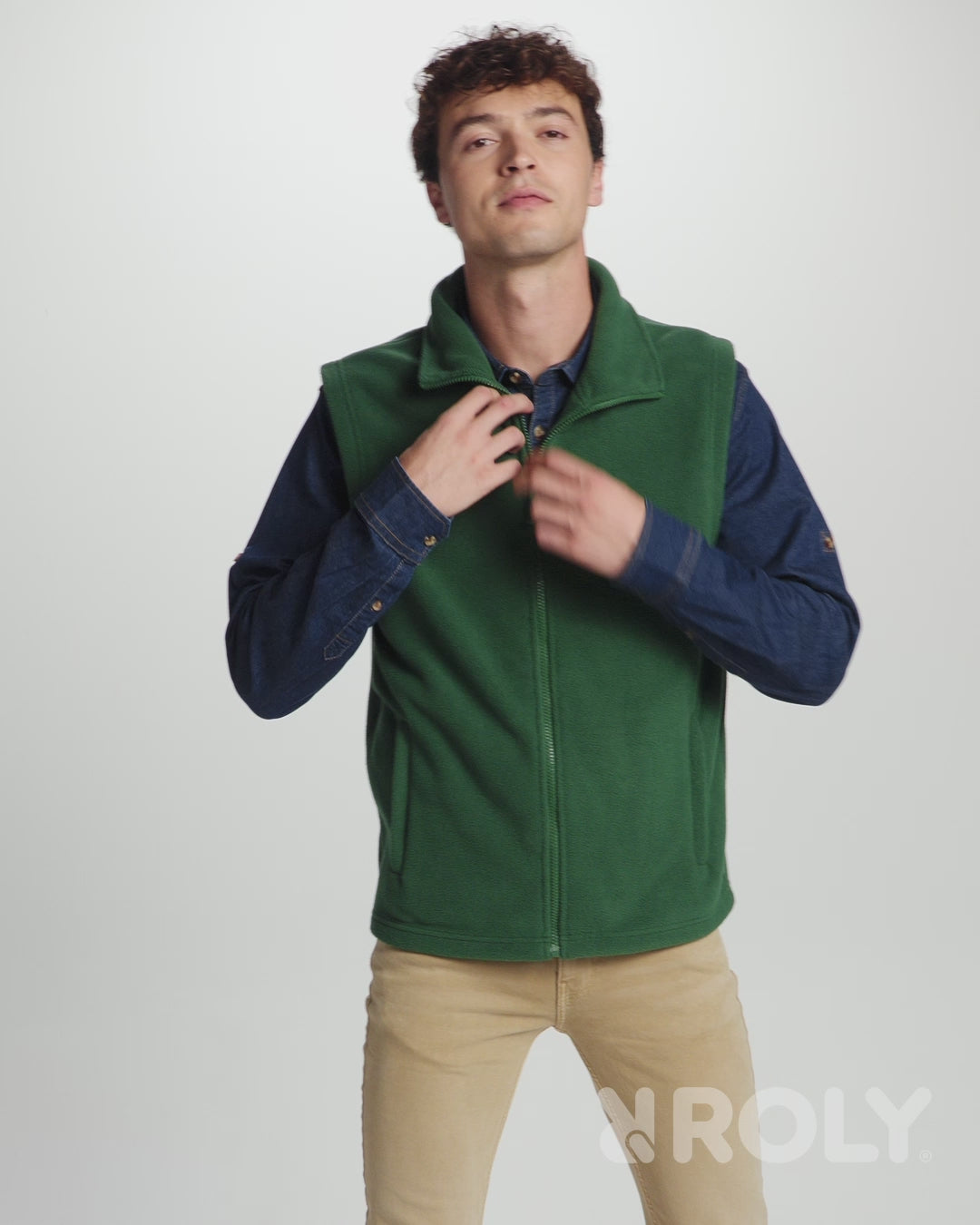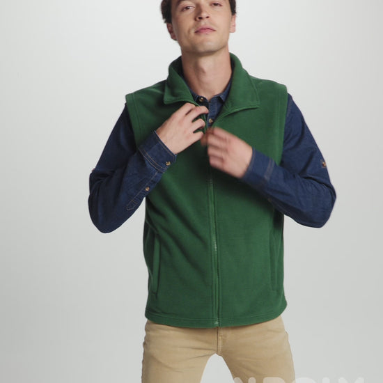 Fleece vest with front zip and high collar. Zip pockets integrated into the side panel seams. Taped seams with herringbone ribbon. All accessories in matching colours. Internal side adjusters.