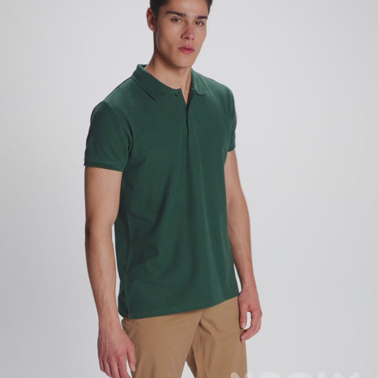 Short-sleeve polo shirt in OCS certified organic cotton. 1x1 ribbed collar and sleeve edging. 2-button placket. Reinforced covered seams in collar. Side slits on hem. Optional pocket.
