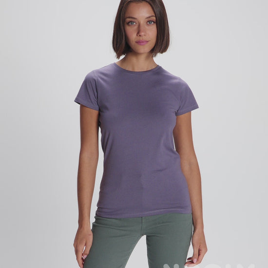Fitted short-sleeve t-shirt for women in OCS certified organic cotton. 1x1 ribbed crew neck. Reinforced covered seams in collar. Side seams.