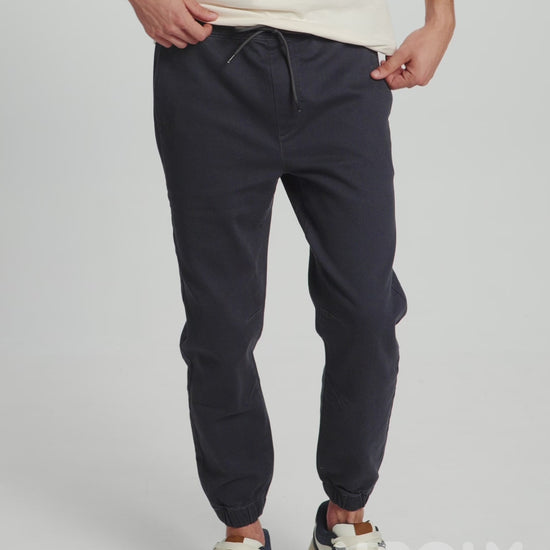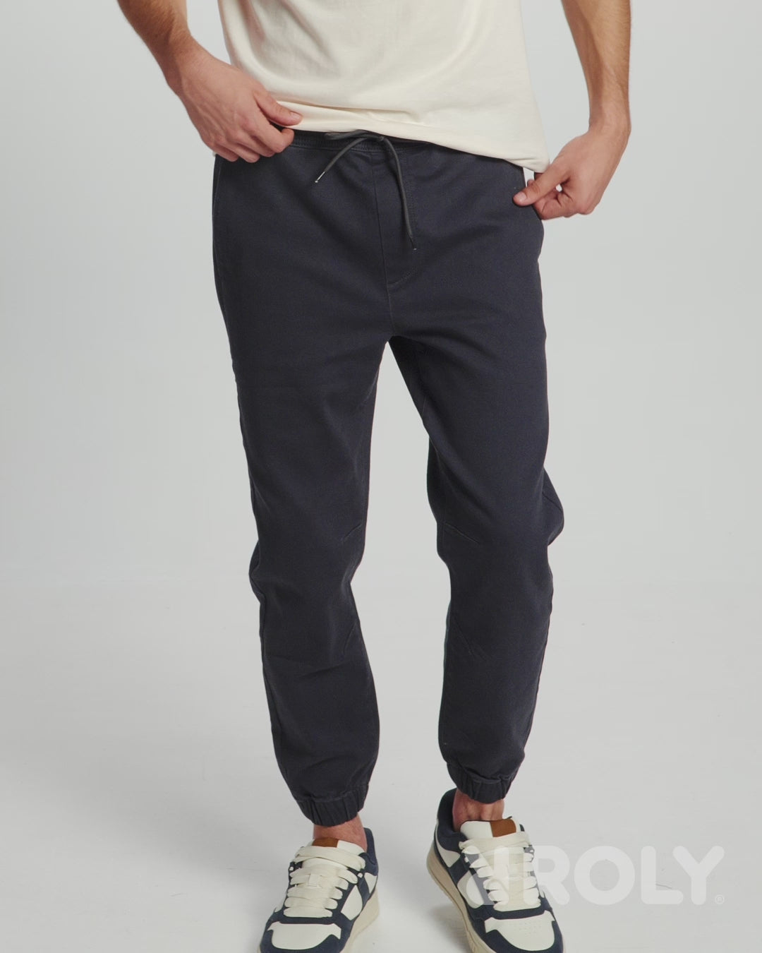 Joggers with elasticated waistband and cuffs. Round tone-on-tone drawstring inside part of the waistband. Side pockets and a single back welt pocket. Decorative darts at knee level.