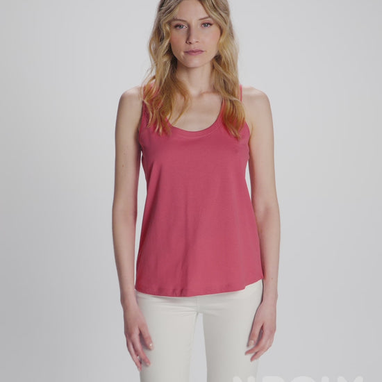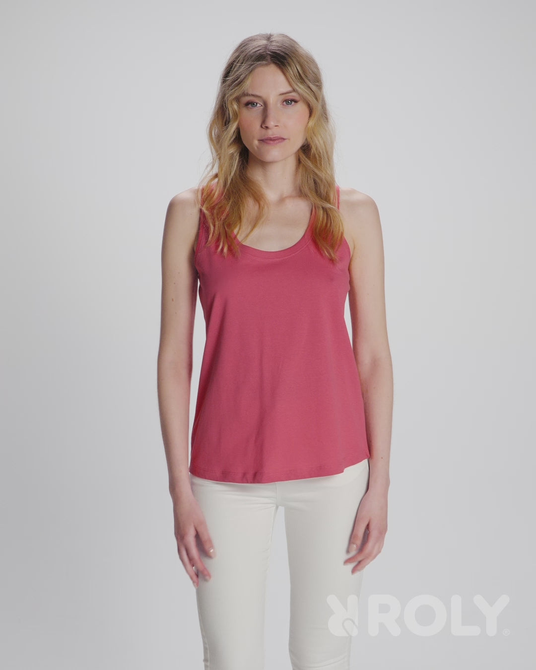 Loose t-shirt for women with wide straps. 1x1 ribbed neckline and armholes. Round-shaped hem. Side seams.