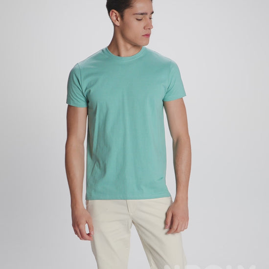 Tubular short-sleeve t-shirt. Crew neck with elastane. Side seams in kids sizes.